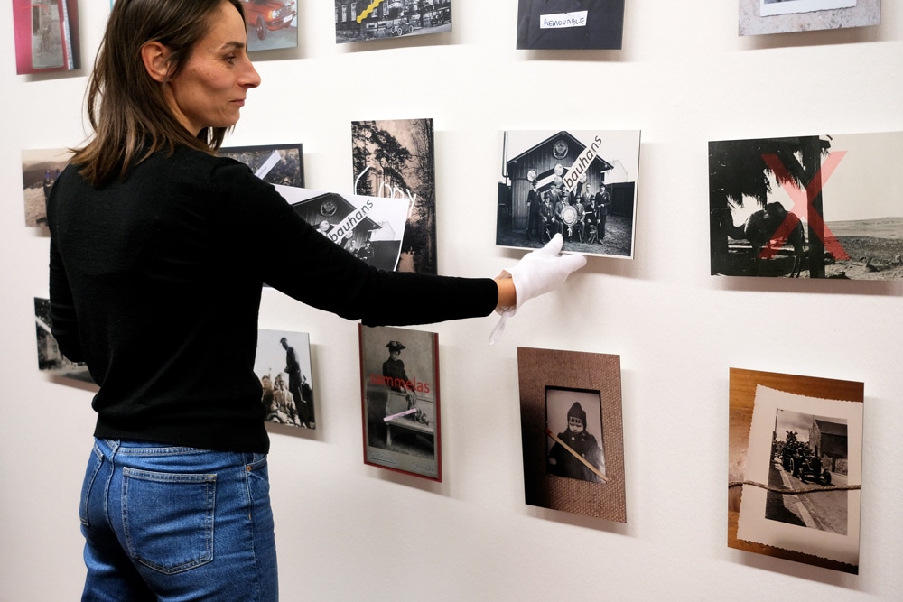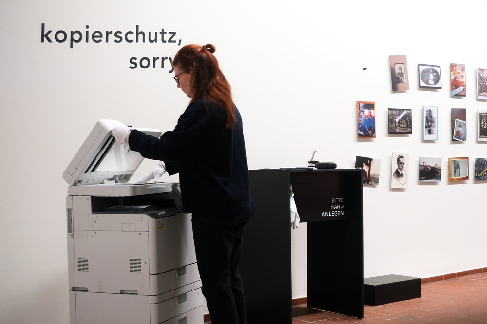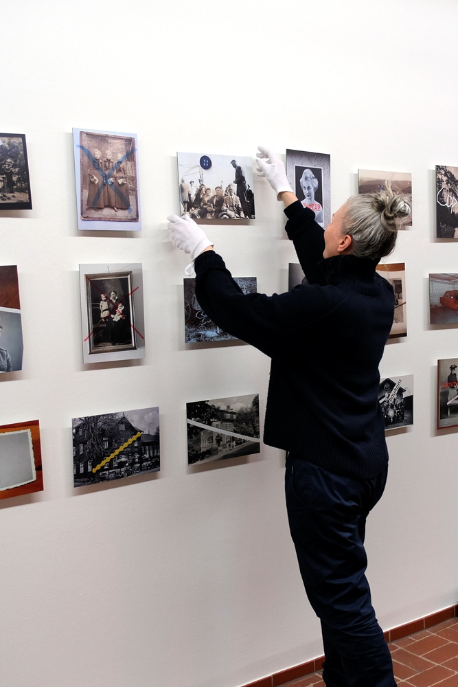 Auf Online-Verkaufsplattformen werden in rauen Mengen Privatfotografien jeglicher Couleur u.a. unter dem Schlagwort echt alt feilgeboten. Auffällig ist bei den verschiedensten Anbietern das Bedürfnis ihre Bildware vor weiterer Verbreitung schützen zu wollen. Dafür finden sie kreative Lösungen und nutzen u.a. ganz analoge Hilfsmittel, wie Streichhölzer, Stifte, Gummis, um ein Wasserzeichen zu erzeugen. Die zum Verkauf stehenden Fotografien bekommen so eine ganz neue Erzählung und überraschende grafische Qualität. Mit der interaktiven Installation kommen die neuen Bilder in Bewegung. Die Ausstellungsbesucher:innen nehmen das in die Hand – sie wählen aus, stellen zusammen, tragen es ist die Welt.