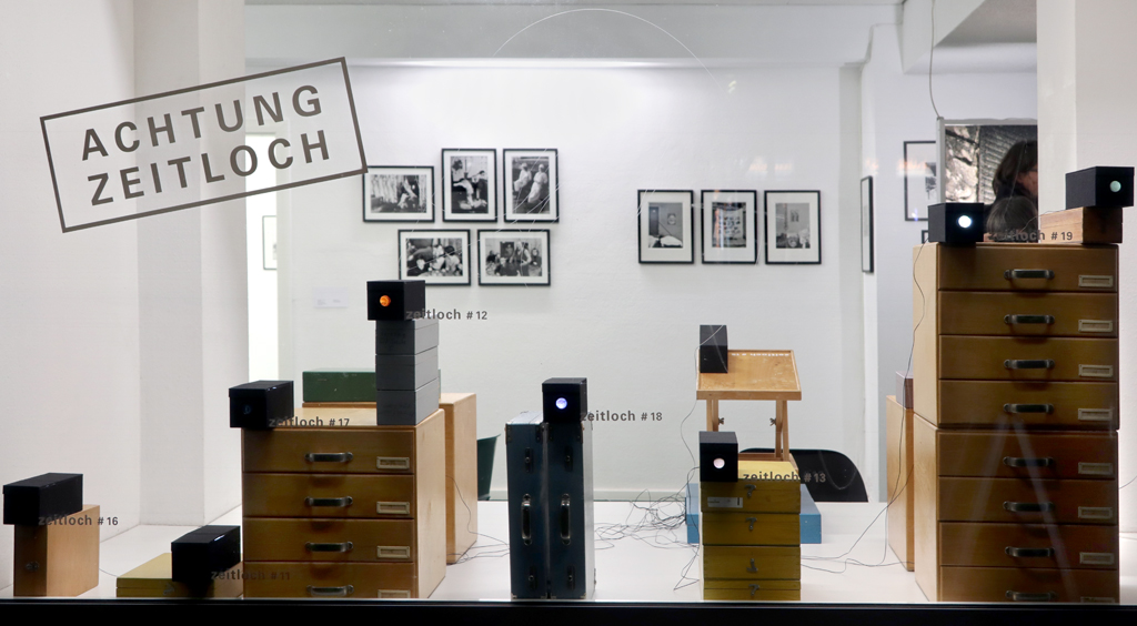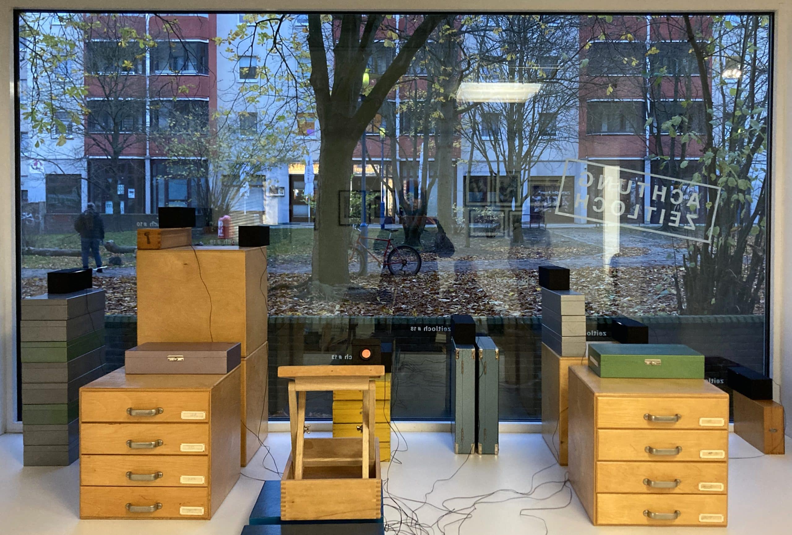 Mixed-Media-Installation, Diacollagen in leuchtenden Miniguckkästen, fortlaufend